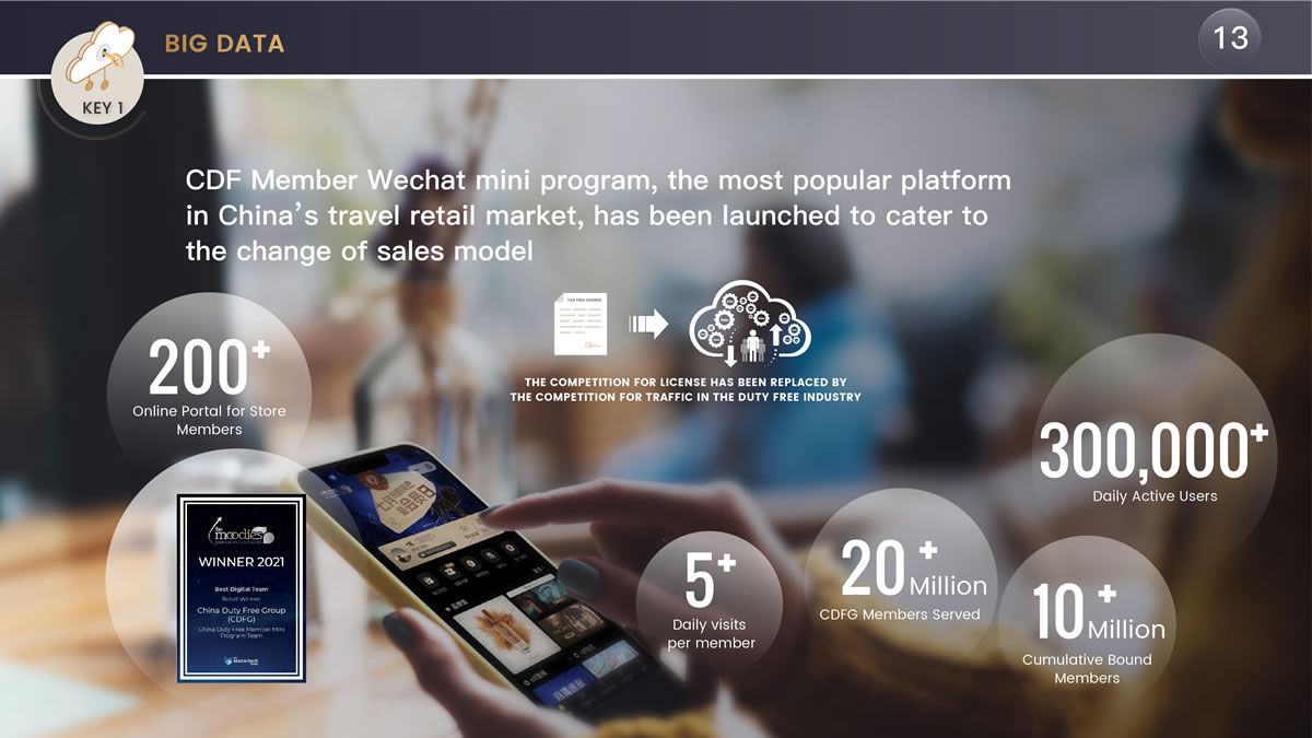 陳國強(qiáng)表示,"我們推出了基于會(huì)員的線上平臺(tái)cdf會(huì)員購,此外還積極迎合銷售模式的變化,推出了基于中免2000多萬會(huì)員的會(huì)員小程序,在流量為王的時(shí)代建立了中國旅游零售市場最大的流量平臺(tái)。"他介紹稱,"通過兩年多的運(yùn)營,該會(huì)員小程序日活躍用戶達(dá)30多萬,成為中免甚至是中國旅游零售重要的流量平臺(tái),未來機(jī)場口岸的客流恢復(fù)后還將成為打通中免線上線下的重要流量入口。"這一舉措也得到了業(yè)內(nèi)的高度認(rèn)可,榮獲穆迪2021年度最佳數(shù)字團(tuán)隊(duì)獎(jiǎng)。