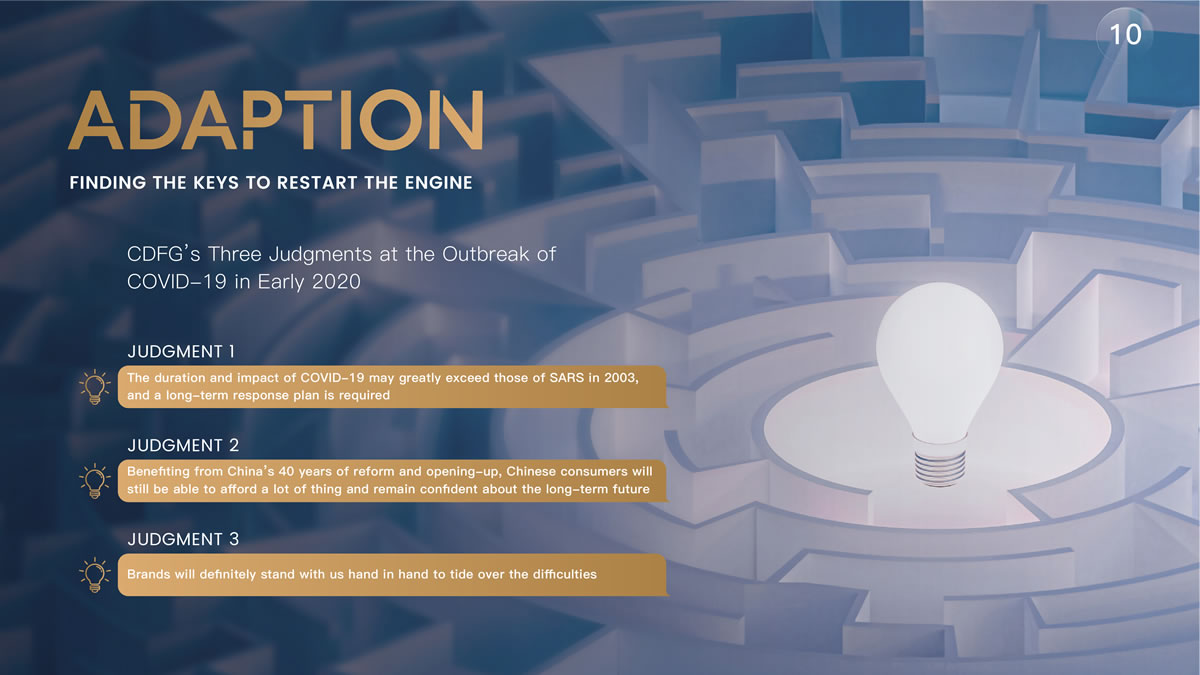 陳國強(qiáng)指出:"在三年前疫情剛剛爆發(fā)時(shí),我做出了3個(gè)判斷:一是這場疫情的持續(xù)時(shí)間可能會(huì)大大超過2003年的非典,我們必須做出長期的應(yīng)對規(guī)劃;二是雖然疫情會(huì)帶來各方面的不利影響,但在中國40年改革開放的紅利下,消費(fèi)者仍保持著強(qiáng)勁的消費(fèi)能力并對未來長期充滿信心;三是品牌方一定會(huì)和我們站在一起,共謀方略,共渡難關(guān)。"