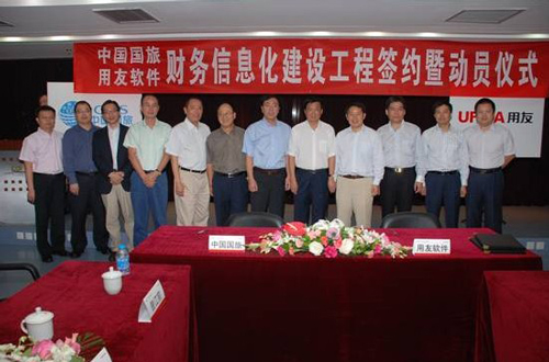 2010年8月27日下午,在中免集團(tuán)10層多功能廳,中國國旅和用友公司舉行了‘財(cái)務(wù)信息化建設(shè)工程簽約暨動(dòng)員儀式’,國旅股份總裁張建華先生和用友公司總裁王文京共同簽署了‘股份公司財(cái)務(wù)信息化項(xiàng)目’的主合同,中免集團(tuán)總經(jīng)理盧路先生與用友公司高級(jí)副總裁吳健先生共同簽署了‘中免集團(tuán)財(cái)務(wù)系統(tǒng)項(xiàng)目’的子合同,合同的簽署,標(biāo)志著中免集團(tuán)‘總部系統(tǒng)項(xiàng)目’建設(shè)工作正式啟動(dòng)并進(jìn)入實(shí)施階段。
