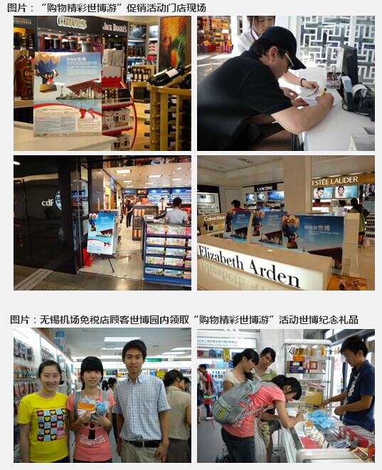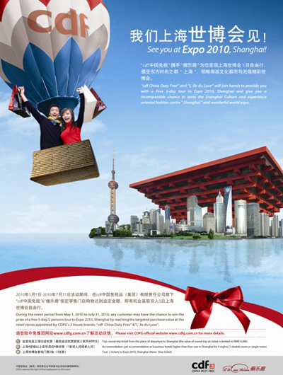 中免集團(tuán)利用2010年上海世博會(huì)所帶來(lái)的商機(jī),聯(lián)合集團(tuán)下屬零售門店及品牌供應(yīng)商進(jìn)行了以“購(gòu)物精彩世博游”為主題的聯(lián)合促銷活動(dòng)?;顒?dòng)歷時(shí)4個(gè)月,從2010年5月1日開(kāi)始,并于2010年8月31日精彩落幕。