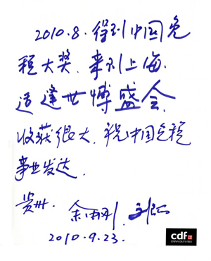“接到中獎(jiǎng)通知電話的時(shí)候有些以外了,有些不敢相信,不過(guò)在聽(tīng)到工作人員的詳細(xì)介紹后就覺(jué)得很開(kāi)心自己能夠獲得特等獎(jiǎng),隨后又收到了貴公司寄給我的獲獎(jiǎng)通知及合同還有世博會(huì)門票,就覺(jué)得做的很細(xì)致,也完全相信了我確實(shí)是這么幸運(yùn)了,非常高興。”