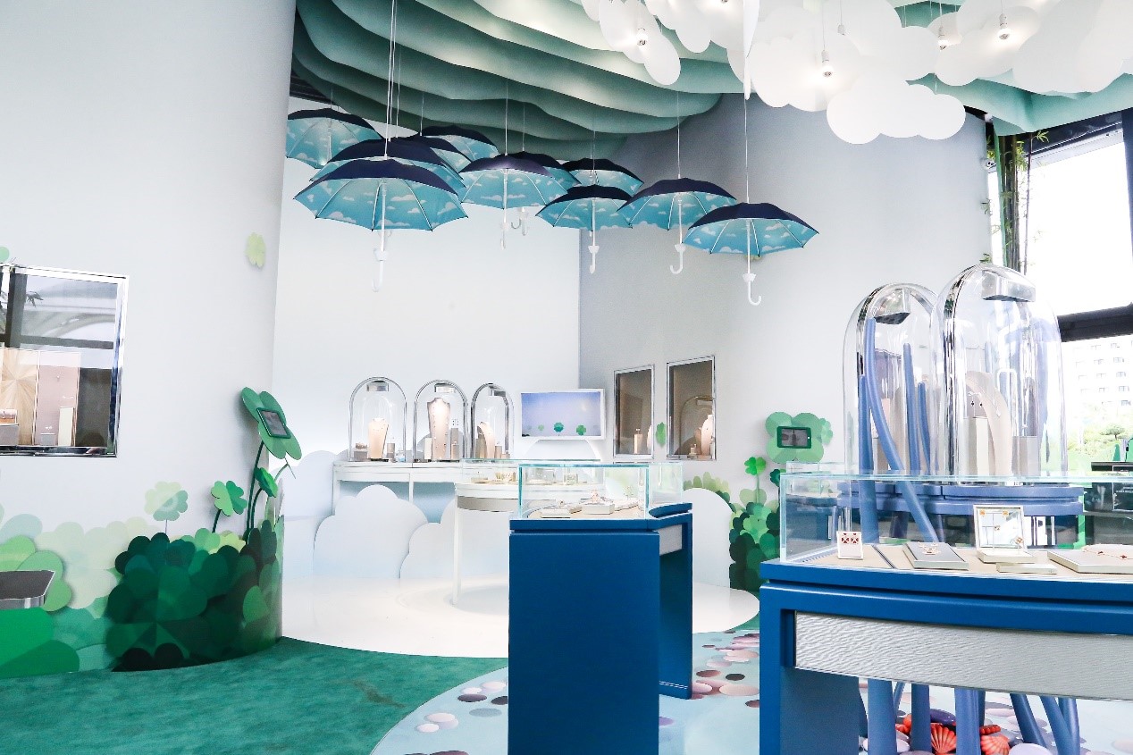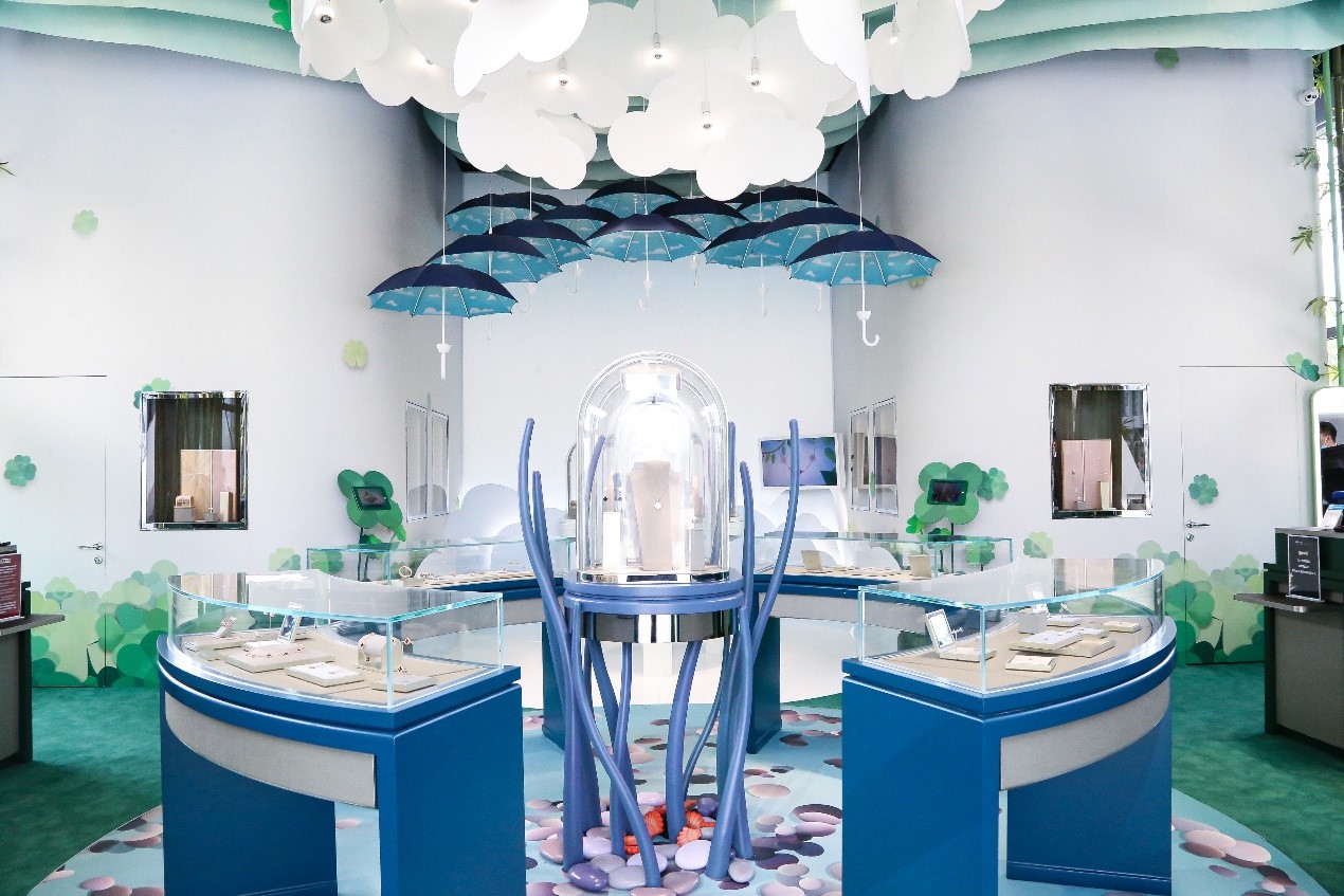 Van Cleef & Arpels梵克雅寶“Alhambra幸運花園”免稅限時精品店位于三亞國際免稅城后廣場。世家要員雅克·雅寶Jacques Arpels常言道:“心懷幸運之愿,方能成為幸運之士?!毙疫\是梵克雅寶一直以來十分珍視的價值,更是其創(chuàng)意靈感的泉源之一,因此限時精品店內部設計以世家標志性四葉幸運圖案為主題,以延續(xù)這珍貴價值。進店后,首先映入訪客眼簾的將是Burcu & Geoffrey 這對法國和土耳其的導演拍檔為Alhambra 特別創(chuàng)作的四葉圖騰造型蝴蝶沿途散播幸運的種子,帶領游客穿梭在幸運花園中,引領大眾一同探索夢幻迷人的Alhambra 幸運花園, 為游客營造出一種舒適愉快的珠寶欣賞空間。