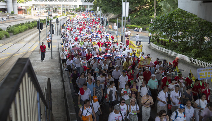 8月17日下午,在超過32度高溫的天氣情況下,集團(tuán)領(lǐng)導(dǎo)和在港各部司員工及部分員工家屬800余人,積極響應(yīng)香港中國企業(yè)協(xié)會的呼籲,參加了香港「保普選、反占中」大聯(lián)盟發(fā)起的「和平普選大遊行」,表達(dá)港中旅員工擁護(hù)「一國兩制」和基本法、依法實施普選的願望和訴求。張學(xué)武董事長和姜巖董事副總經(jīng)理到維園集會現(xiàn)場為大家加油鼓勁,張逢春總會計師、許慕韓副總經(jīng)理等集團(tuán)領(lǐng)導(dǎo)和員工隊伍一起全程參加了遊行。
