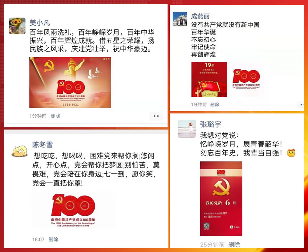奮斗百年路,啟航新征程。為慶祝黨的百年華誕,激發(fā)黨員群眾愛黨愛國熱情,近日來,公司各級黨組織、團(tuán)組織積極組織黨員和團(tuán)員青年開展了形式多樣的主題活動,表達(dá)對中國共產(chǎn)黨的無限熱愛和對祖國的美好祝福!
