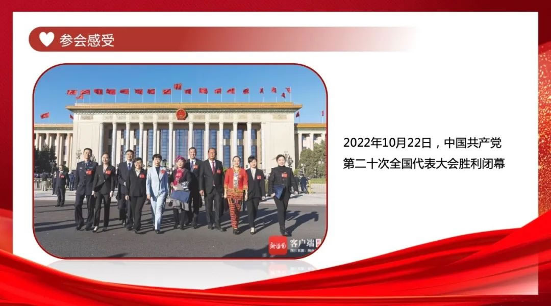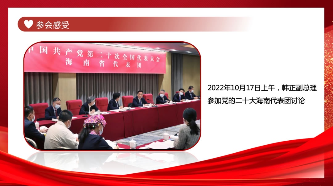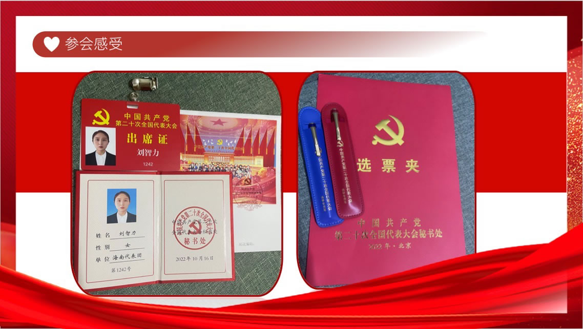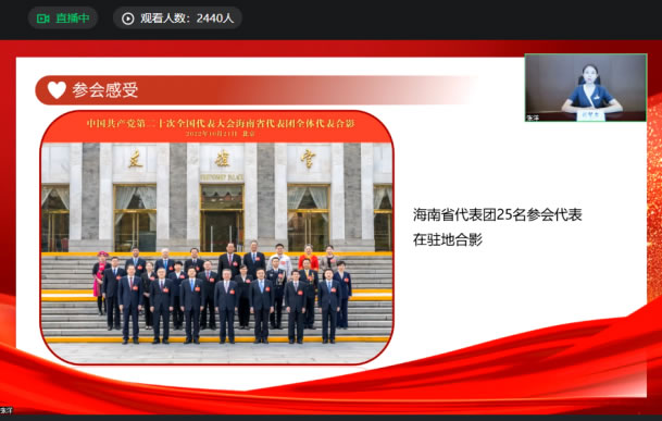 宣講會(huì)上,她分享了參加黨的二十大的所見(jiàn)所聞所感,并從新時(shí)代青年、基層黨員、海南旅游零售行業(yè)從業(yè)者三個(gè)身份,就如何貫徹黨的二十大精神分享學(xué)習(xí)體會(huì)。